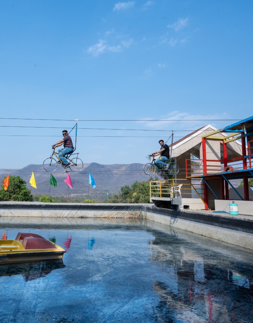 Explorers adventure, water, sports activities at one place near pune. our all activities are fear-free zone. You can enjoy with your friends, family, and couples. Our activities like Boating, Sky-Cycling, Hanging Bridge, Swimming Pool, Rain Dance, Children Park, Tree-Rope Activity, Camp Fire, Tractor Ride, Trekking, Waterfall, Indoor and Outdoor Games Burma Bridge, Zipline, Kids Adventure zone and many more. Sky Cycling is our main attraction which is available for the first time in Pune only at Vishwasgadh.